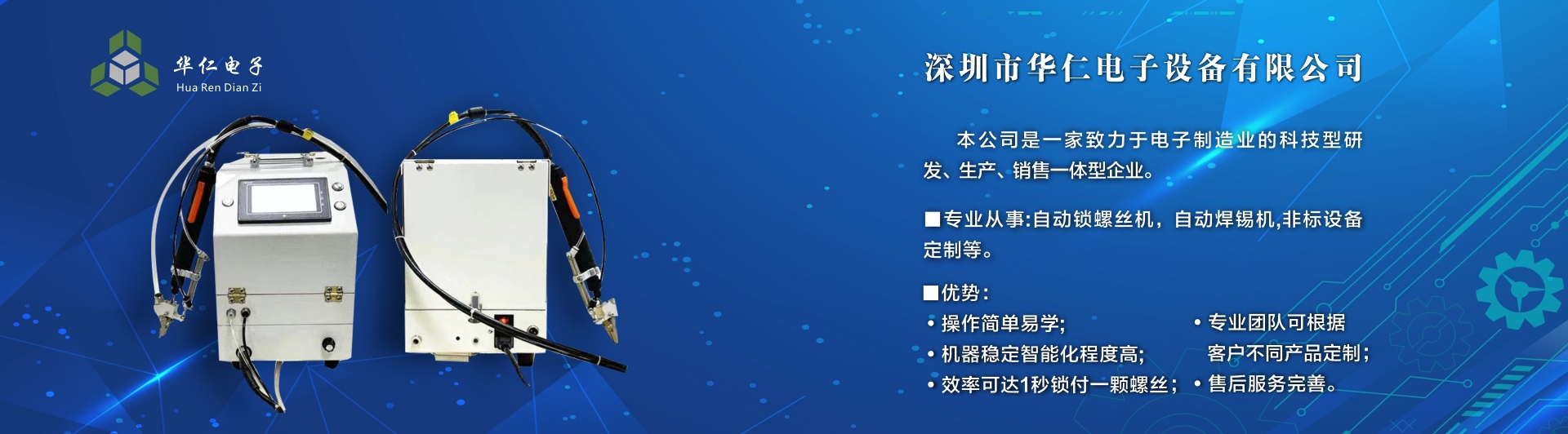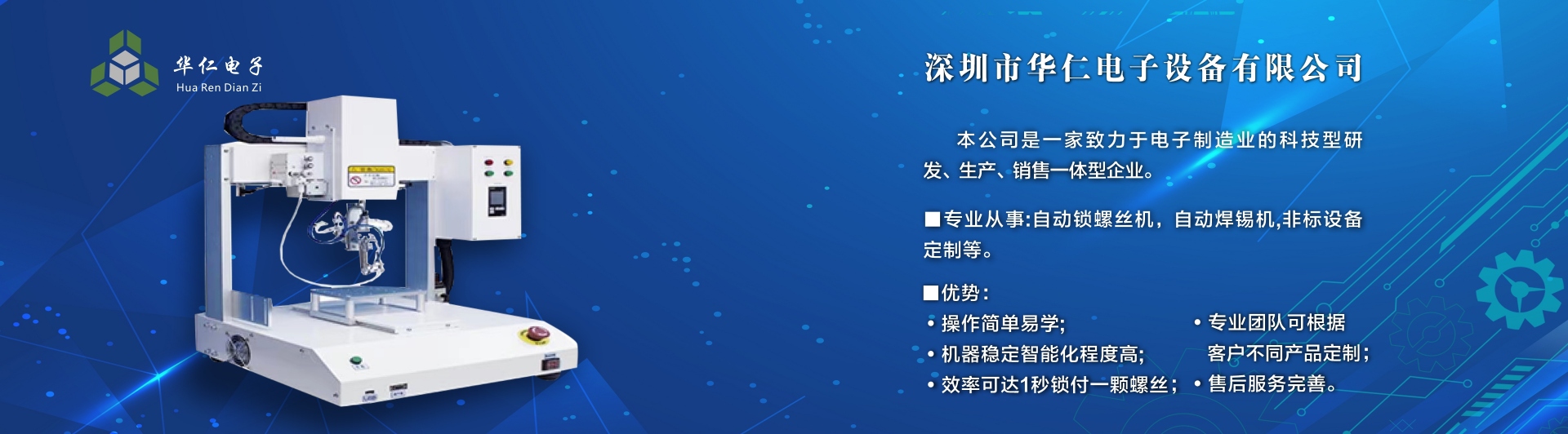 深圳市華仁電子設(shè)備有限公司是一家致力于電子制造業(yè)周邊設(shè)備的科技型研發(fā)、生產(chǎn)、銷售一體的企業(yè),專業(yè)從事:自動(dòng)鎖螺絲機(jī);自動(dòng)焊錫機(jī);非標(biāo)設(shè)備定制機(jī)等,公司長(zhǎng)期以來在行業(yè)中積累了豐富的經(jīng)驗(yàn),擁有專業(yè)的研發(fā)、技術(shù)、銷售支持工程團(tuán)隊(duì)、各高級(jí)技術(shù)人才為客戶提供優(yōu)質(zhì)產(chǎn)品和服務(wù),同時(shí)不斷吸取國(guó)內(nèi)外先進(jìn)技術(shù),更準(zhǔn)確及時(shí)地為客戶提供優(yōu)質(zhì),性價(jià)比高的產(chǎn)品、公司以專業(yè)的售前、售中、售后服務(wù)贏得了客戶的信賴和好評(píng),為客戶提供先進(jìn)自動(dòng)化設(shè)備一體式解決方案、